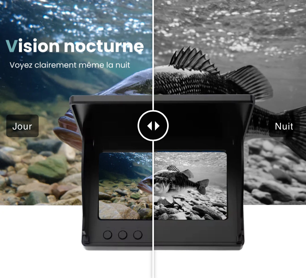 Avec la vue directe sous l’eau, vous identifiez instantanément herbiers, roches et fosses. Vous ciblez les zones favorables et optimisez chaque lancer.